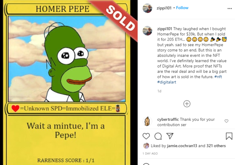 With more than $300M spent on NFTs this year, it is no surprise that one of the rarest Pepe NFTs “Homer Pepe” just changed hands for $320,000.